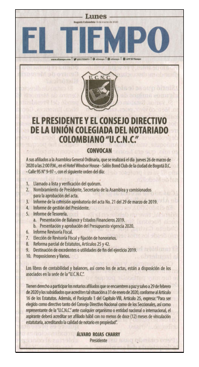 Citación Asamblea Ordinaria Presencial de Asociados UCNC 26 de marzo 2020. Aviso Informativo – Asamblea General – 2020Descargar