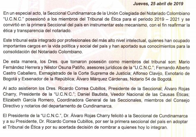 Seccional de Cundinamarca posesionó a los miembros del tribunal de las causas éticas Notariales. Boletín N° 29Descargar