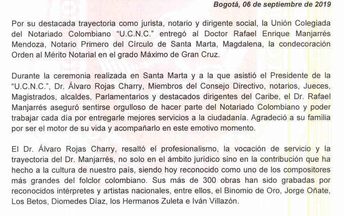 “U.C.N.C.” Condecoró al Doctor Manjarrés, Notario Primero de Santa Martha, Magdalena. Ver entrada Boletín N°67Descargar