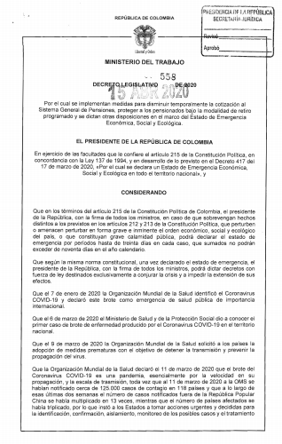 Medidas para disminuir temporalmente la cotización al Sistema General de Pensiones y proteger a los pensionados de abril de 2020 – Medidas transitorias en procesos de insolvencia Decreto Presidencial N°. 558Descargar
