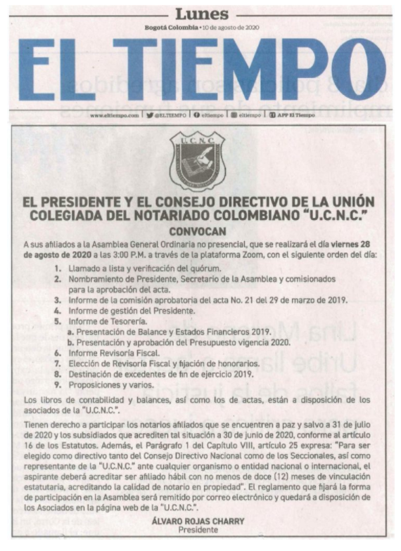 Citación Asamblea Ordinaria No Presencial de Asociados UCNC 28 de Agosto 2020. Aviso Informativo – Asamblea General – 2020Descargar