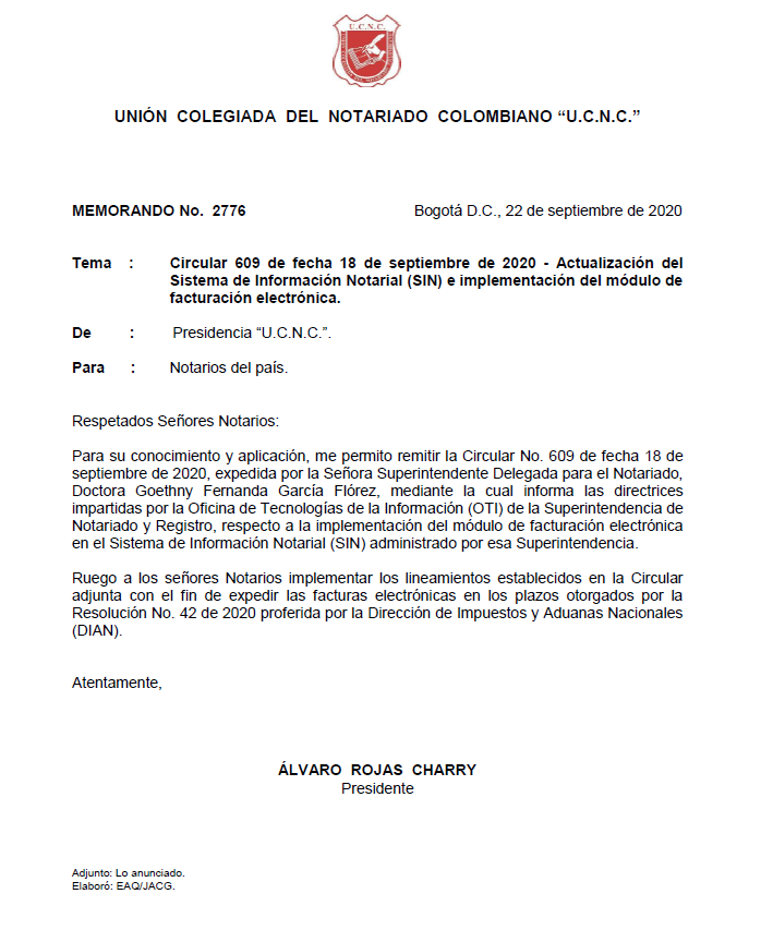 Circular 609 de fecha 18 de septiembre de 2020 – Actualización del Sistema de Información Notarial (SIN) e implementación del módulo de facturación electrónica. Memorando N° 2776Descargar AnexoDescargar