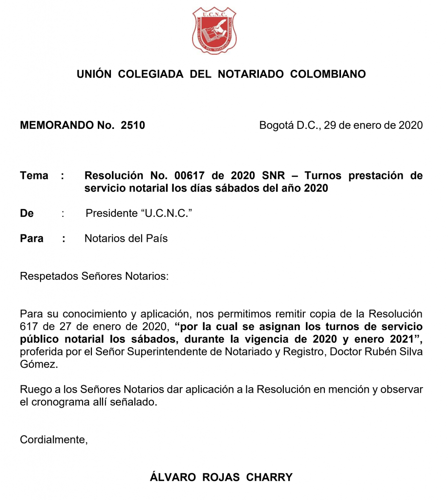 Resolución No. 00617 de 2020 SNR – Turnos prestación de servicio notarial los días sábados del año 2020 Memorando No. 2510Descargar Resolución No. 617 de 2020Descargar
