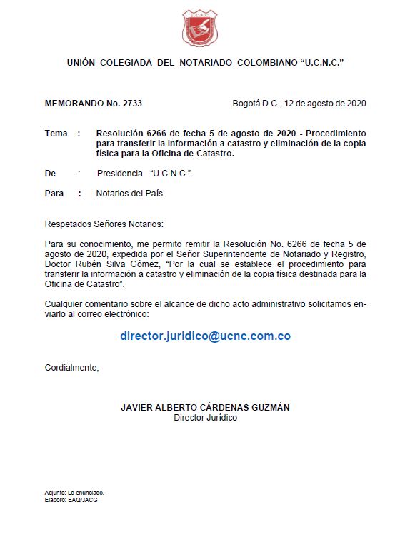Resolución 6266 de fecha 5 de agosto de 2020 – Procedimiento para transferir la información a catastro y eliminación de la copia física para la Oficina de Catastro. Memorando N° 2733Descargar Anexo 2733Descargar