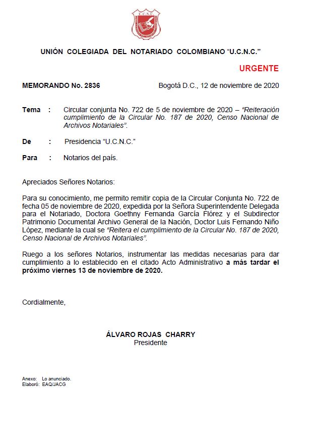 Circular Conjunta No. 722 SNR – Reiteración cumplimiento Circular No. 187 Censo Notarial. Memorando N° 2836Descargar AnexoDescargar