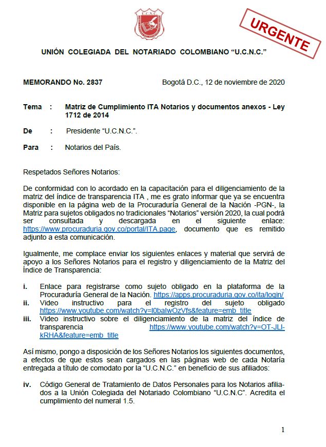 Matriz ITA Notarios y documentos anexos . Ley 1712 de 2014. Memorando N° 2837Descargar Anexo 1Descargar Aneo 2Descargar Anexo 3Descargar Anexo 4Descargar