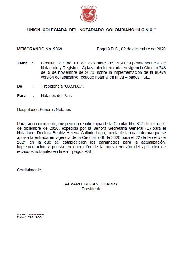 Circular 817 SNR – Aplazamiento entrada en vigencia Circular 748, sobre la implementación de la nueva versión del aplicativo recaudo notarial en línea – pagos PSE Memorando N° 2869Descargar AnexoDescargar
