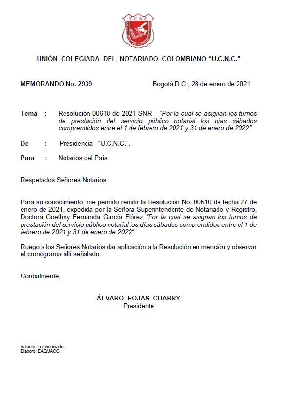 Resolución 00610 de 2021 SNR – Por la cual se asignan los turnos de prestación del servicio público notarial los días sábados Memorando N° 2939 Descargar