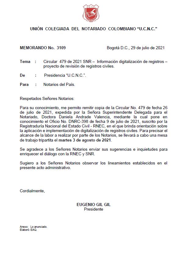 Circular 479 de 2021 SNR – Información digitalización de registros – proyecto de revisión de registros civiles. Memorando 3109Descargar