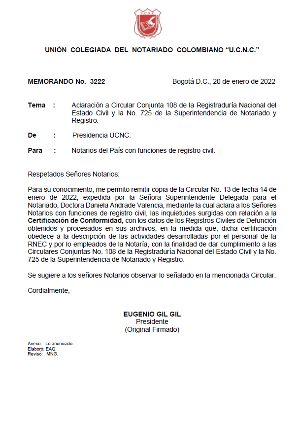 Aclaración a Circular Conjunta 108 de la RNEC y la No. 725 de la SNR.