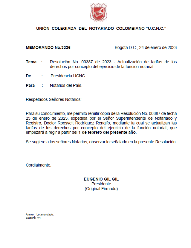 Resolución No. 00387 de 2023 – Actualización de Tarifas de los Derechos por Concepto del Ejercicio de la Función Notarial Memorando 3336Descargar