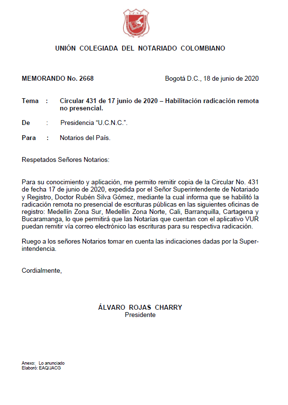 Circular 431 de 17 junio de 2020 – Habilitación radicación remota no presencial. Memorando N° 2668Descargar Anexo N° 1Descargar