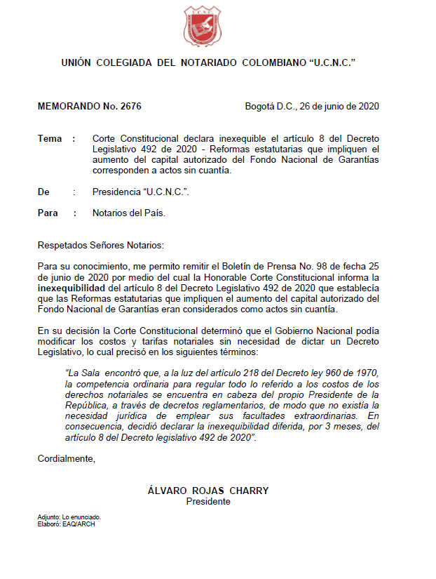 Corte Constitucional declara inexequible el artículo 8 del Decreto 492 de 2020 Reformas estatutarias para aumentar el capital autorizado del Fondo Nacional de Garantías. Memorando N° 2676Descargar Anexo N° 1Descargar