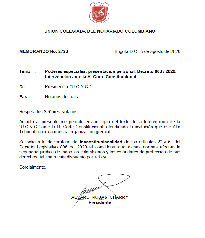Notarios del país. Poderes especiales, Presentanción personal, Decreto 806 de 2020. Intervención ante la H. Corte Constitucional Memorando N° 2723Descargar Anexo IntervenciónDescargar