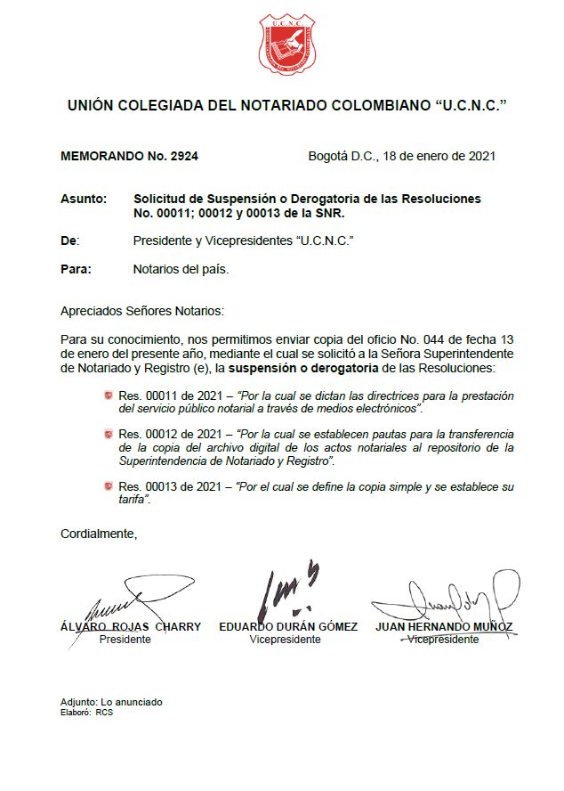 Notarios del país. Solicitud de Suspensión o Derogatoria de las Res. 11, 12 y 13 SNR. Memorando N° 2924Descargar