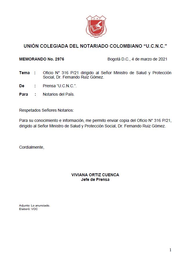 Oficio No. 316 dirigido al Señor Ministro de Salud y Protección Social, Dr. Fernando Ruiz Gómez Memorando N° 2976Descargar