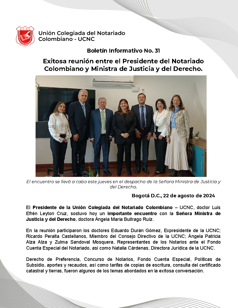 Boletín Informativo No. 31 – Exitosa reunión entre el Presidente del Notariado Colombiano y Ministra de Justicia y del Derecho