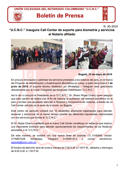 En procura de mejorar y optimizar los servicios prestados a los notarios del país, en el marco del Proyecto de Identificación y Autenticación Biométrica en Línea, a partir del próximo 1 de junio de 2019, el soporte técnico telefónico y/o WhatsApp – Telegram será gestionado directamente por la Unión Colegiada del Notariado Colombiano “U.C.N.C.”.